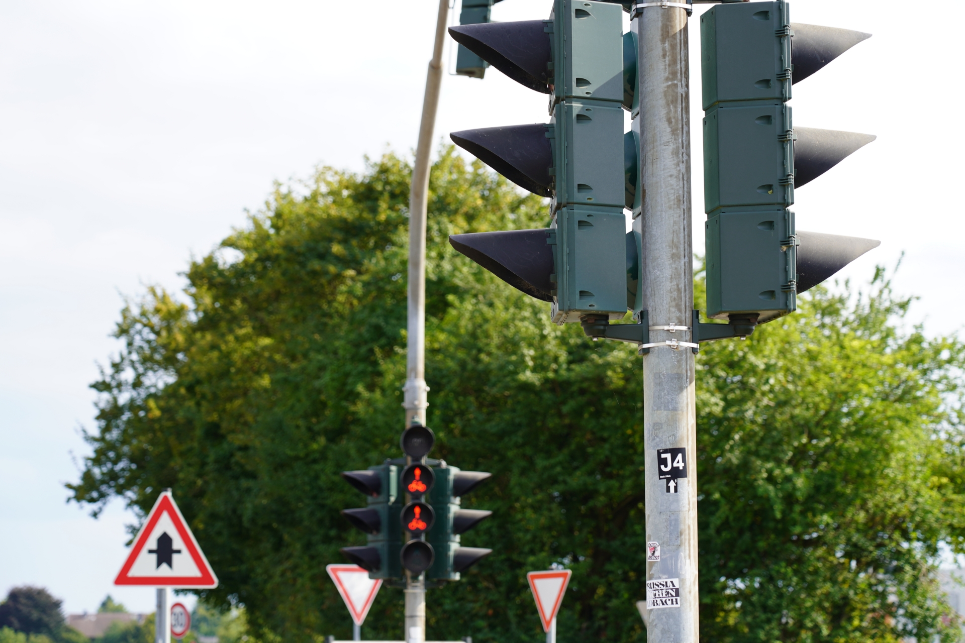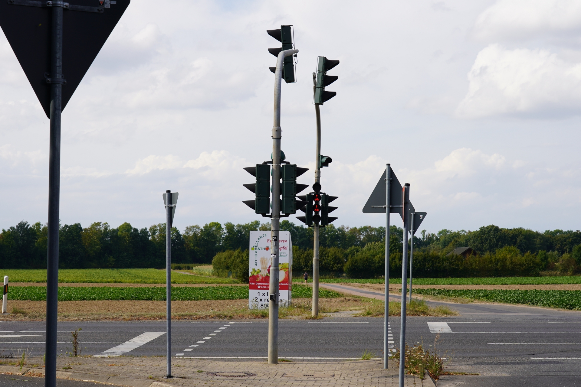 Kleinere T-Kreuzung mit tannengrünen Siemens Signalgebern aus den frühen 2000er Jahren. Die Anlage ist vermutlich mit einem C800VP (Plus-Technik) ausgestattet. Um 2014 wurde hier die Fahrbahn erneuert, die Signalanlage temporär eingelagert und später an neuen Masten wieder montiert, was ehr unüblich ist.