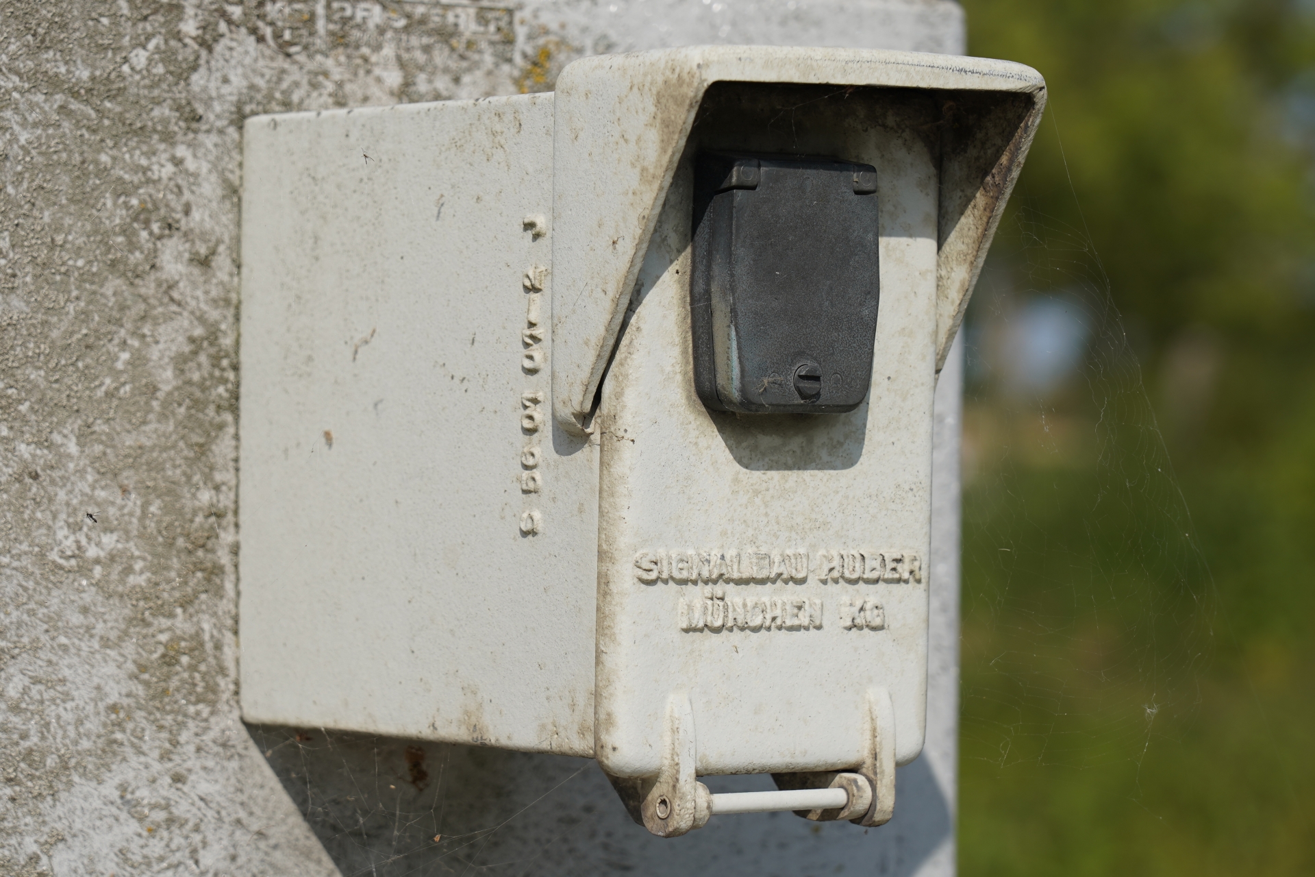 Der linke Kasten trägt ein Logo von Signalbau Huber-Designa GmbH, der rechte einen Aufkleber von SAG. Möglicherweise handelt es sich bei den Kasten von Huber um das alte Steuergerät der vorherigen Anlage.
