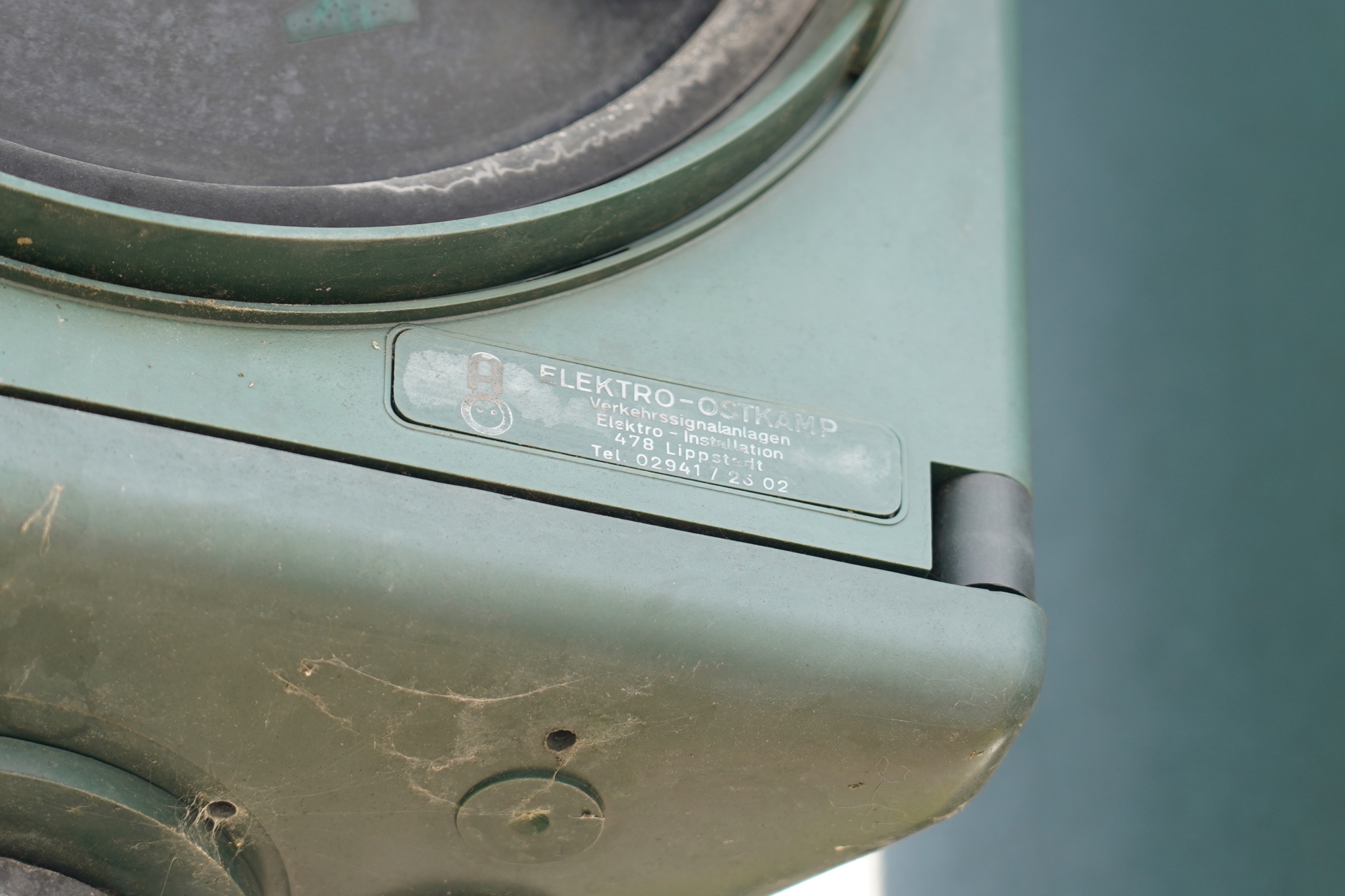 Hier handelt es sich um eine ältere LSA von Signalbau Huber mit tannengrünen Global-Signalgebern. Seit einigen Jahren scheint sich die Firma Stührenberg um die Instanthaltung zu kümmern. Daher wurden bereits mehrere Signalgeber gegen eigene Produkte getauscht. Die neusten sind sogar bereits in LED-Technik ausgeführt.