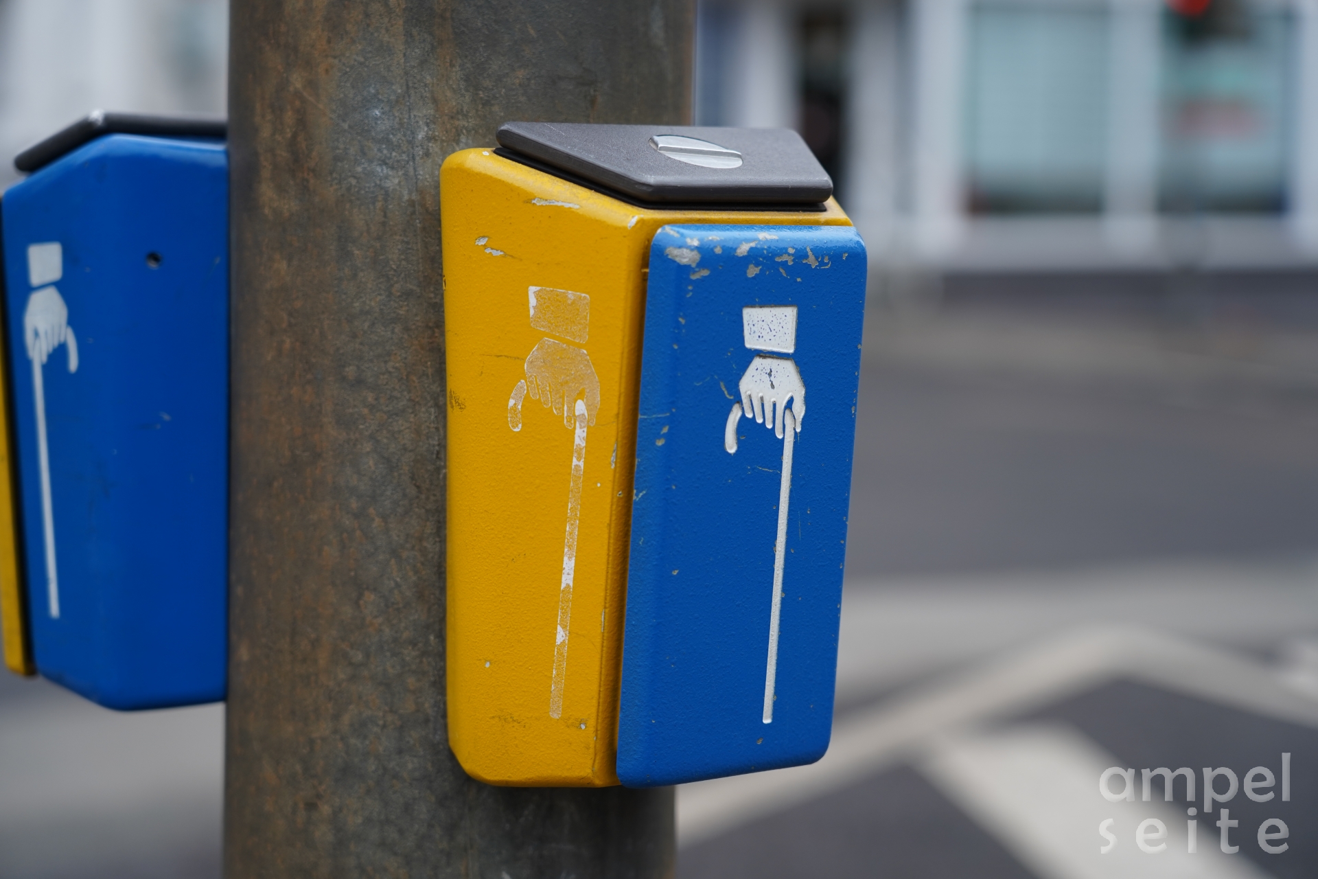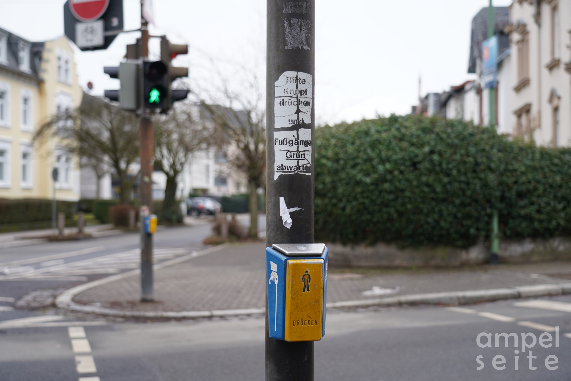Diese Fussgängerschutzanlage sichert eine kleine Querung in einer sehr schmalen Wohnstraße. Die Signalgeber von Gebr. Stoye sind noch in einem hervorragenden Zustand.